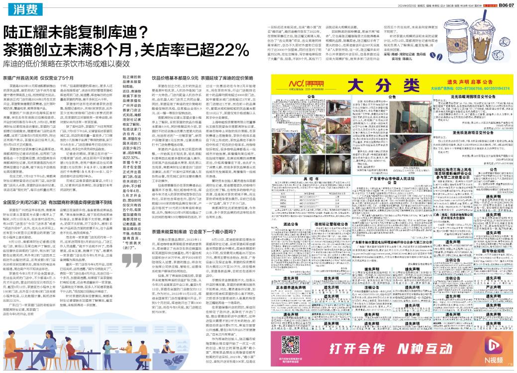 陆正耀的新品牌未能复制库迪。 近日,库迪咖啡旗下茶饮品牌茶猫在广州开设的首家门店正式关闭。南都湾财社记者核实了解到,包括这家门店在内,近期,茶猫在全国关闭的门店至少有25家,闭店率高达22.32