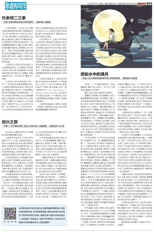 ◎作者:珠海市容闳学校五年级龙彦竹 ◎指导老师:曾建高 代老师挎着一个白色小包,穿着淡青色旗袍款的教师服,高跟鞋发出“哒,哒”的声响,步子不疾不徐。她个子不高,身材瘦削,头发逐渐发白,粗糙又淡