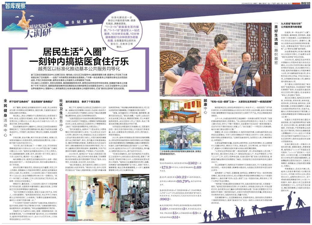 第8站越秀 标准化建设进一步推动公共服务更均衡、便捷和高效,满意度更高。 “1+3+N”家庭医生签约服务、“1+1+18”退役军人一站式服务、10分钟文化圈、10分钟健身圈和15分钟优质为