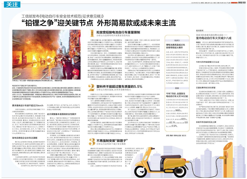电动自行车“铅锂之争”迎来关键节点。 近日,工信部发布《电动自行车安全技术规范(征求意见稿)》,征求意见稿从整车质量、脚踏骑行、塑料件占比和防篡改等方面作了调整。其中,在行业和社会最为关注的整车