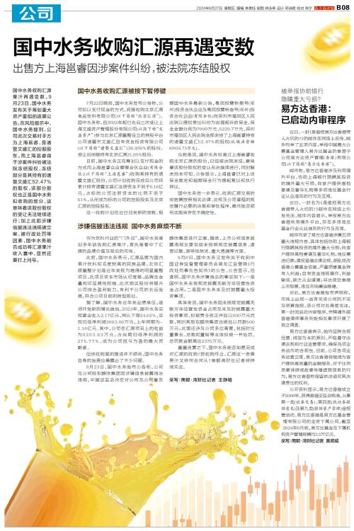 国中水务收购汇源果汁再遇变数。9月23日,国中水务发布关于筹划重大资产重组的进展公告。在风险提示中,国中水务提到,公司此次交易对手方为上海邕睿,是诸暨文盛汇的控股股东。而上海邕睿由于涉案件纠纷被法