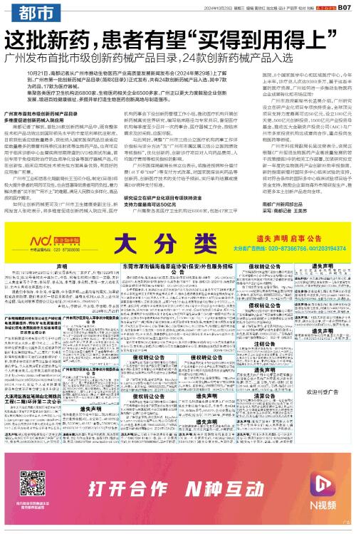 10月21日,南都记者从广州市推动生物医药产业高质量发展新闻发布会(2024年第29场)上了解到,广州市第一批创新药械产品目录(简称《目录》)正式发布,共有24款创新药械产品入选,其中7款为药品,
