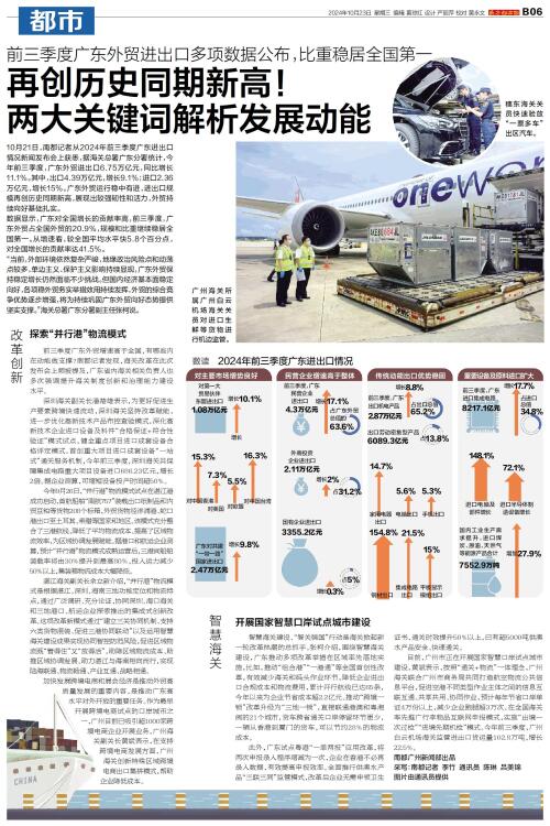 10月21日,南都记者从2024年前三季度广东进出口情况新闻发布会上获悉,据海关总署广东分署统计,今年前三季度,广东外贸进出口6.75万亿元,同比增长11.1%。其中,出口4.39万亿元,增长9.