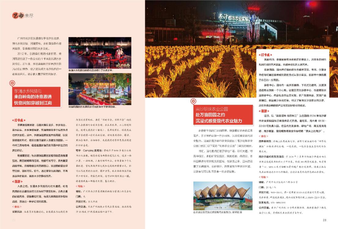 南沙位于广州最南端,地处粤港澳大湾区地理几何中心,不仅有欣欣向荣的产业,还有“山城田江海”交相辉映,是迷人的旅游天堂和度假天堂。白天,可以看候鸟翩跹绘就生态画卷,可以打卡绝美的海滨风光;夜幕降临后,南沙露出了另一种美。蕉门河夜市繁华与宁静交织的休闲时光是多么写意,南沙客运港横档船夜航慧谷超级堤、明珠湾大桥、横沥、灵山“双岛尖”是多么畅快……Come on,跟随本期《艺游未尽》解锁南沙必打卡景区,不用远游,但快乐后劲很大!
