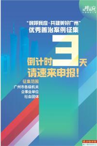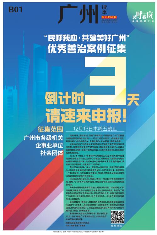 民有所呼,我有所应。距离“民呼我应·共建美好广州”优秀善治案例征集活动截止时间——12月13日(本周五),仅剩最后3天。有意向的广州市各级机关、企事业单位、社会团体,请尽快申报。 征集活动由广州