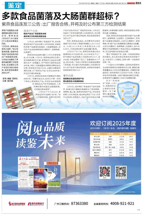多款产品菌落及大肠菌群疑似超标引发关注后,紫燕食品(603057.SH)连发3个公告对此事做出回应。 12月8日,紫燕食品发布公告称,“经公司复核排查,视频中发布的产品