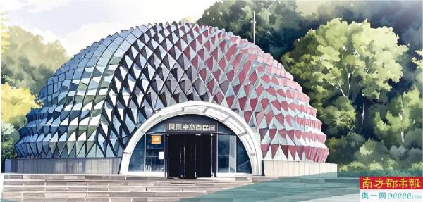 流溪温泉广场上的地标建筑之一凤凰生态直播间。