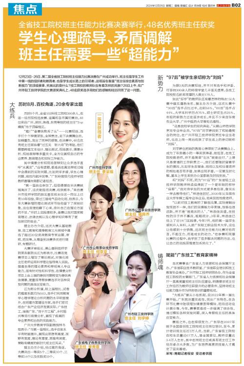 12月23日-26日,第二届全省技工院校班主任能力比赛决赛在广州成功举行。班主任是学生工作中第一线的组织者和教育者,也是学生成长路上的引领者。这场旨在衡量“班主任综合素质与创新能力”的顶级赛事,究竟比的是什么?技工院校的教师队伍有着怎样的风貌?26日上午,在广州市轻工技师学院的大赛颁奖典礼上,48名获奖选手用他们的感触和经历回答了这一问题。