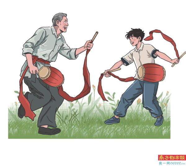 课间问了师父,他原是陕北一家文工队的,在队里打得一手好鼓。借着改革春风来广东闯荡,没想到这打鼓的技艺竟还有一用。我得知师父教这鼓挣的是极少的,那又是为了什么?面对疑问,他笑了笑,脸挤成一团,显得更苍老了:“不为什么,我不能让祖宗的宝贝传不下去啊!”