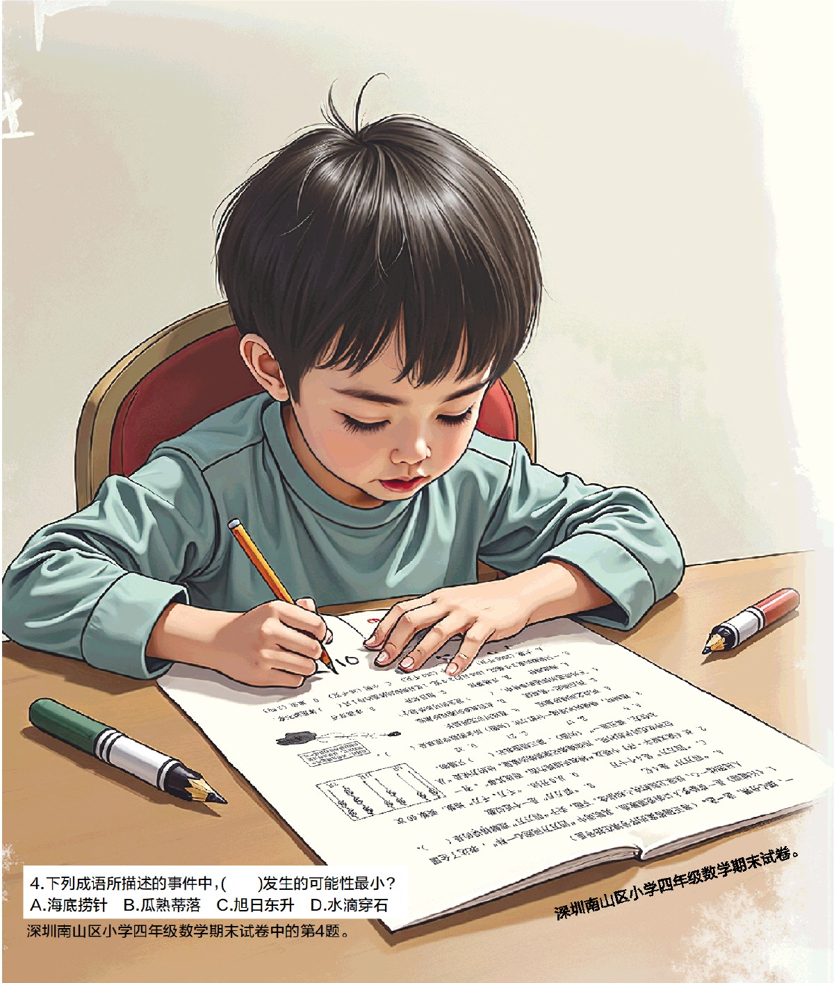 另外,在招浩军看来,对数学思维的考察,不应只是通过一大堆文本混淆学生思路,或者借跨学科的名义、以浅层综合性的试题,来挤占学生向学科专业纵深发展的时间和精力。招浩军以南山区四年级数学期末考的第四题举例说明:“如果是考‘寓意’,水滴穿石是一定的,当然选A。但题干里是‘事件’。按照字面意思去解读,数学思维越强的学生,在这题上越容易纠结。”