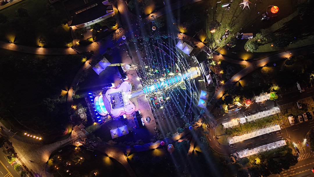 航拍“即刻开声·必燃南沙——湾区校园音乐节”,活动现场摇身变成一把“大吉他”。活动主办方供图