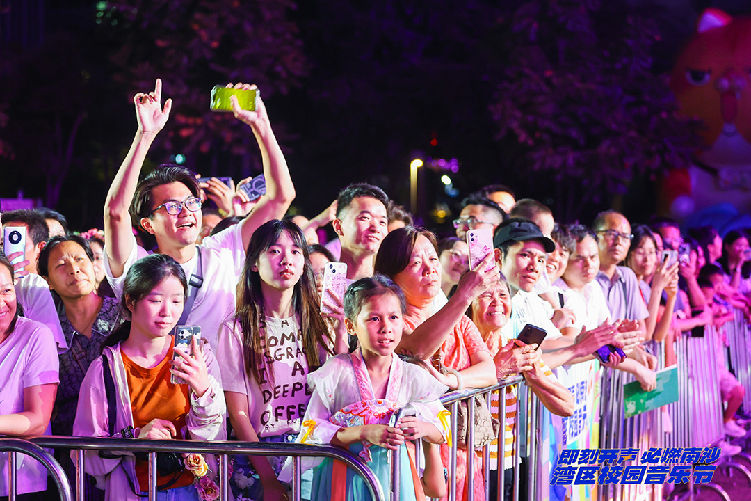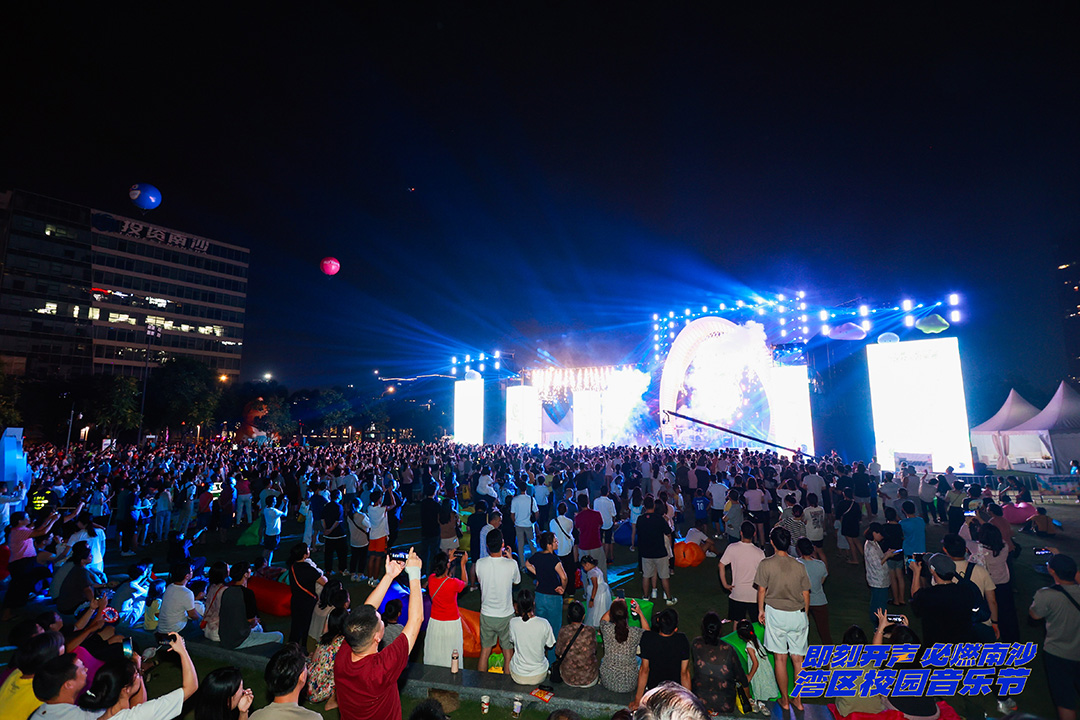 南沙区“蕉河·四季”公园剧场内,形如吉他的舞台将草坪分为两部分,灯光随音乐节奏不断变换颜色,“即刻开声·必燃南沙——湾区校园音乐节”于2024年10月19日、20日,一连两天在此唱响。来自粤港澳大湾区乃至全国的优秀青年音乐人在音乐节上汇聚,用激情四溢的表演和充满创意的音乐作品,展现了当代青年的风采和才华。
