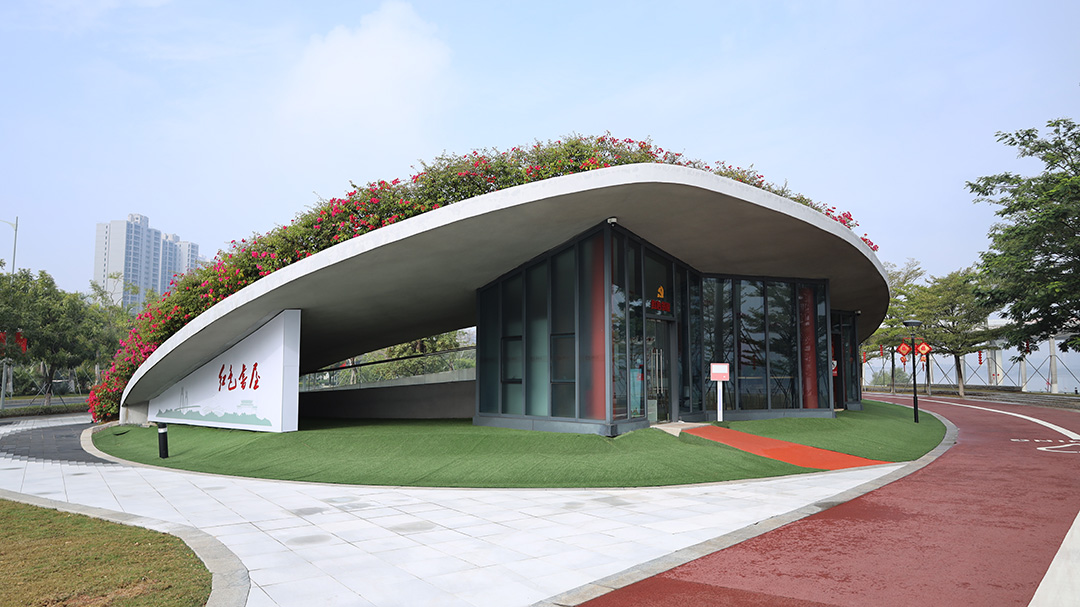 蕉门河片区党群服务中心服务点,为更好地延续区内红色基因,服务点内提供了红色知识类书籍和完善的图书借阅基础设施,为周边居民群众营造一种健康积极的红色学习氛围。在阅读学习红色知识的同时,透过窗外看向那平静而又富有生意的蕉门河,也寓意着南沙区红色基因悠然升起,四季常青。