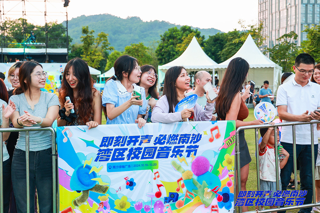 南沙区“蕉河·四季”公园剧场内,形如吉他的舞台将草坪分为两部分,灯光随音乐节奏不断变换颜色,“即刻开声·必燃南沙——湾区校园音乐节”于2024年10月19日、20日,一连两天在此唱响。来自粤港澳大湾区乃至全国的优秀青年音乐人在音乐节上汇聚,用激情四溢的表演和充满创意的音乐作品,展现了当代青年的风采和才华。