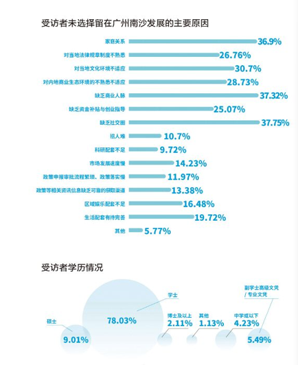 从硬件配套上来看,已基本满足港澳青年的日常居住生活,但工作之外的社交圈如何建立?从细项上来看,影响青年未选择留在广州南沙发展的主要原因有,缺乏社交圈,缺乏商业人脉,家庭关系,对当地文化环境以及对内地商业生态环境、法律规章制度不熟悉等。
