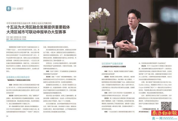 近日,中华全国青年联合会副主席、香港立法会议员霍启刚在接受南都·创享湾区记者专访时表示,十五运为大湾区融合发展提供重要载体。展望今后,大湾区城市可联动申报举办大型赛事。香港应充分发挥国际竞争力的优势,在助力内地链接国际的过程中,扛起更大的责任。(P24-25)