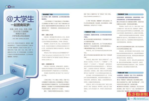 2024年9月,聚焦大学生最关注、最急需、最期盼的政策热点,广州南沙正式印发实施了《南沙区关于开展“图南筑梦”行动的工作方案(试行)》,围绕大学生“乐游、乐学、乐业、乐创、乐居”方面提出五大行动、共13条具体措施,全力将南沙打造成为大学生就业创业的首选地,让大学生实现鲲鹏图南,筑梦南沙。(P36-37)
