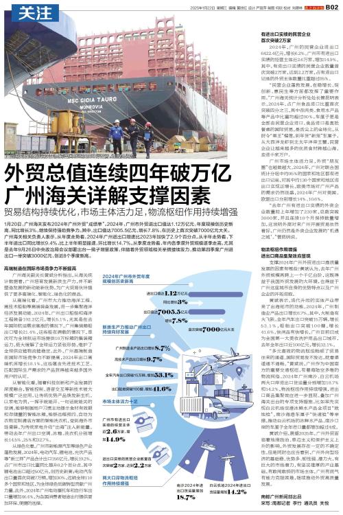 1月20日,广州海关发布2024年广州外贸“成绩单”。2024年,广州市外贸进出口值达1.12万亿元,年度规模创历史新高,同比增长3%,继续保持强劲竞争力。其中,出口值达7005.5亿元,增长7.