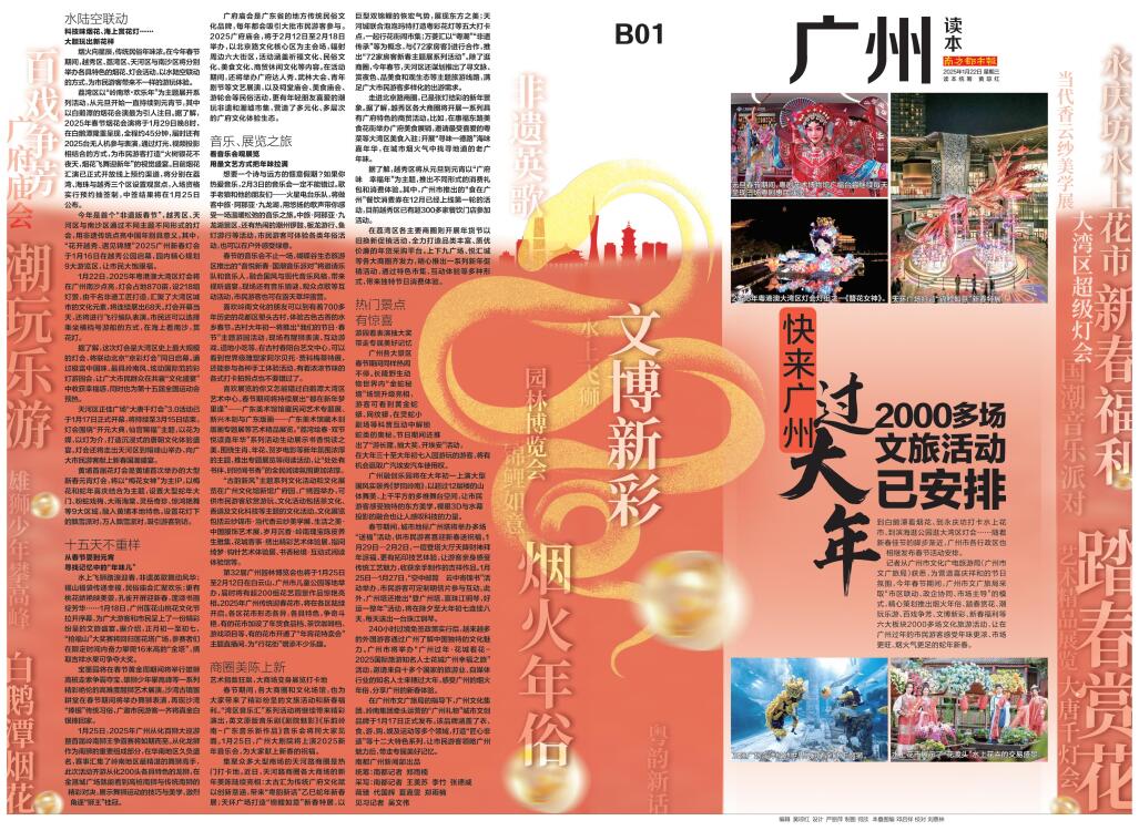 到白鹅潭看烟花、到永庆坊打卡水上花市、到滨海逛公园逛大湾区灯会……随着新春佳节的脚步渐近,广州市各行政区也相继发布春节活动安排。 记者从广州市文化广电旅游局(广州市文广旅局)获悉,为营造喜庆祥和