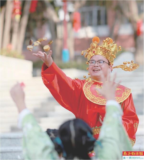 白云区颜乐天纪念中学的校园内,四位身着汉服的家长化身“文化使者”,在拱门前笑意盈盈地迎接学子们,并递上新春挑战:“讲句粤语祝福啦!”“试下唱一小句粤语新年歌?”学子们在欢声笑语中感受粤韵风华。校园内更有“才神爷”惊喜现身,随机为学生撒金币、送“才”运。
