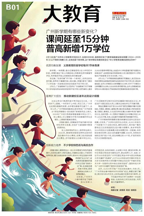2月13日是广州市中小学春季开学的日子,也是中共中央、国务院印发了《教育强国建设规划纲要(2024—2035年)》(以下简称《纲要》)后,迎来的首个新学期。这个新学期会有哪些新变化?中小学教育发展