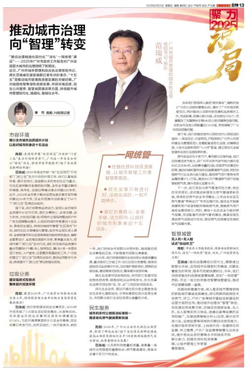 “推动治理精细化现代化”“深化‘一网统管’建设”……2025年广州市政府工作报告对广州这座超大城市的治理指明了新路径。 近日,广州市城市管理和综合执法局党组书记