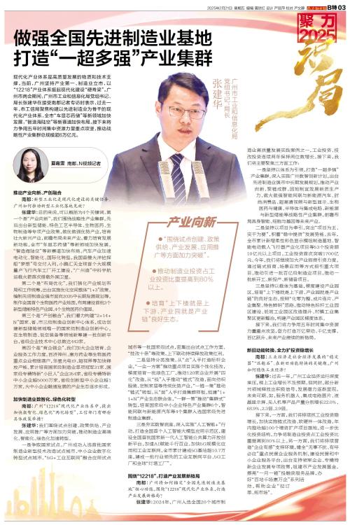 现代化产业体系是高质量发展的物质和技术支撑。当前,广州坚持产业第一、制造业立市,以“12218”产业体系挺起现代化建设“硬脊梁”。广州市两会期间,广州市工业和信息化局党组书记