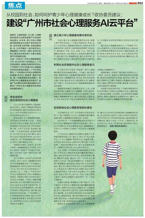 为进一步优化广州市心理健康服务工作,在2025年广州市两会上,广州市政协委员、黄埔区铁铮学校总校长丁丹带来了《关于加强社区心理健康支持体系建设的提案》,广州市政协委员、广州市英东中学校长胡国胜带来提案《关于以“教联体”建设为契机,进一步推进家校社协同育人,呵护青少年心理健康成长的建议》,民建广州市委员会带来集体提案《关于推动广州市社会心理服务体系高质量发展的建议》。