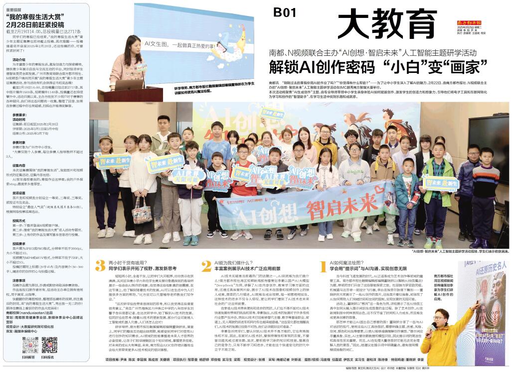 南都讯 “刚刚过去的寒假你用AI赶作业了吗?”“你觉得有什么帮助?”……为了让中小学生深入了解AI的魅力,2月22日,由南方都市报社、N视频联合主办的“AI创想·智启未来”人工智能主题研学活动在I