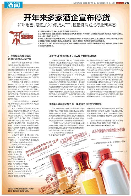 通过停货控量和控价,将成为今年白酒行业的新常态? 近日,南都湾财社-酒水新消费指数课题组记者从市场获悉,泸州老窖、习酒和山西汾酒等先后发出产品停货通知,其中大部分是酒企主力产品。 据了解,过去