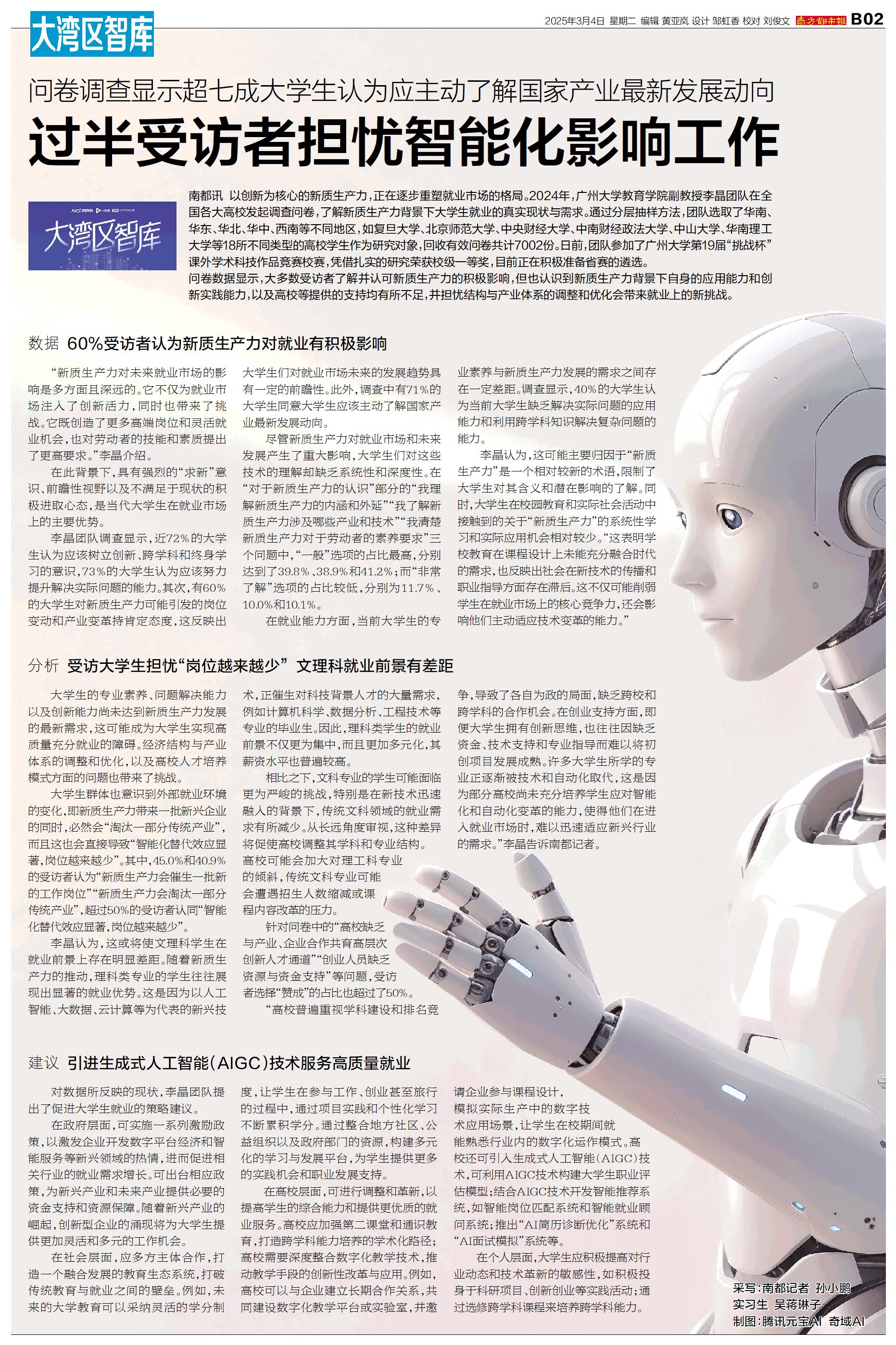 南都讯 以创新为核心的新质生产力,正在逐步重塑就业市场的格局。2024年,广州大学教育学院副教授李晶团队在全国各大高校发起调查问卷,了解新质生产力背景下大学生就业的真实现状与需求。通过分层抽样方法