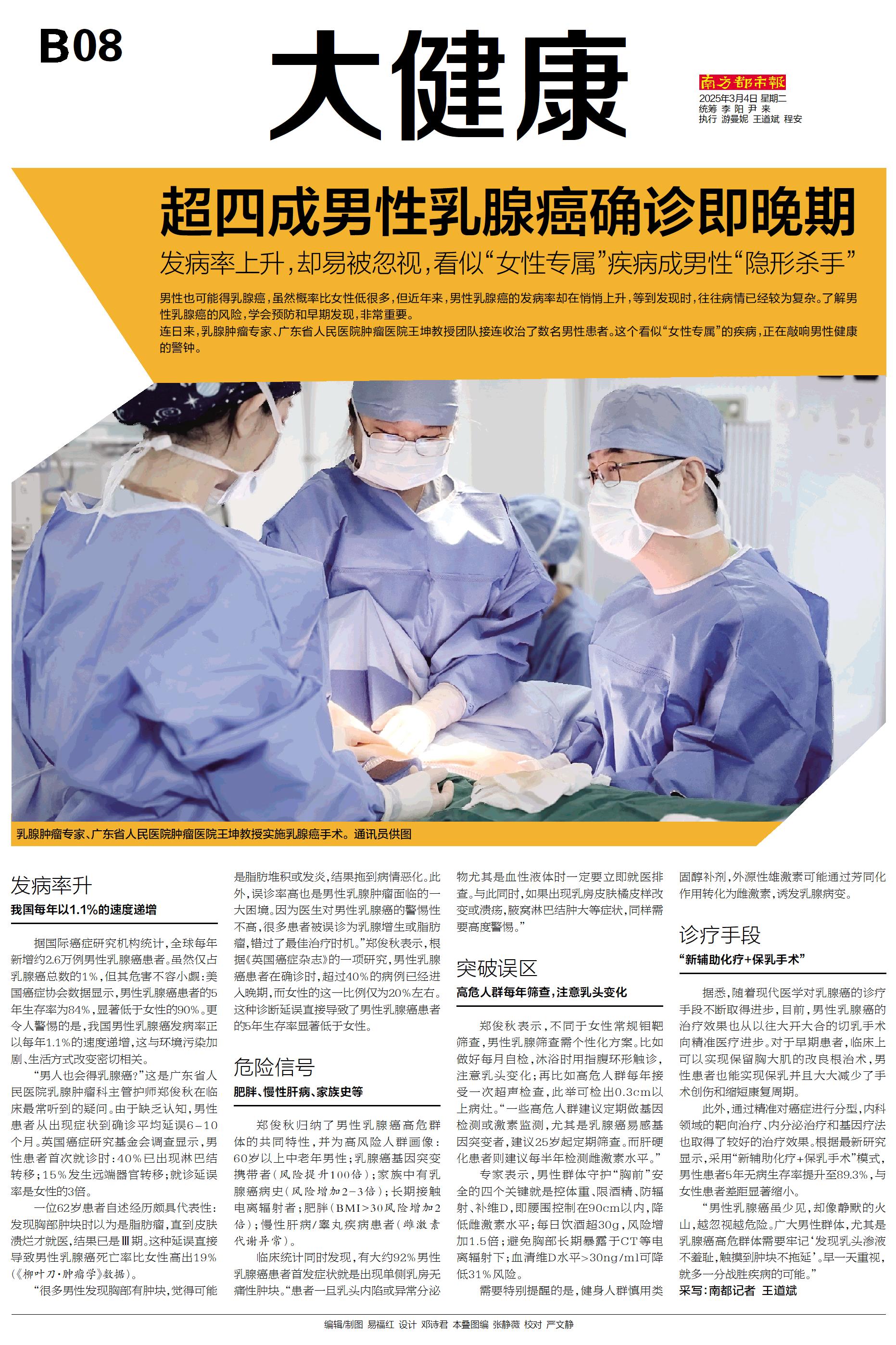 男性也可能得乳腺癌,虽然概率比女性低很多,但近年来,男性乳腺癌的发病率却在悄悄上升,等到发现时,往往病情已经较为复杂。了解男性乳腺癌的风险,学会预防和早期发现,非常重要。 连日来,乳腺肿瘤专家、
