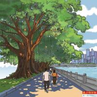 榕树是广州的太阳伞。 几乎每一条广州市的道路都有着榕树的身影,修枝翼布,参差披拂,密叶云浓,在车马喧嚣中安然挺立。宽大的树冠就像是一把把支撑着的大凉伞,绿荫如盖,庇护着广州。 榕树的叶子终年长