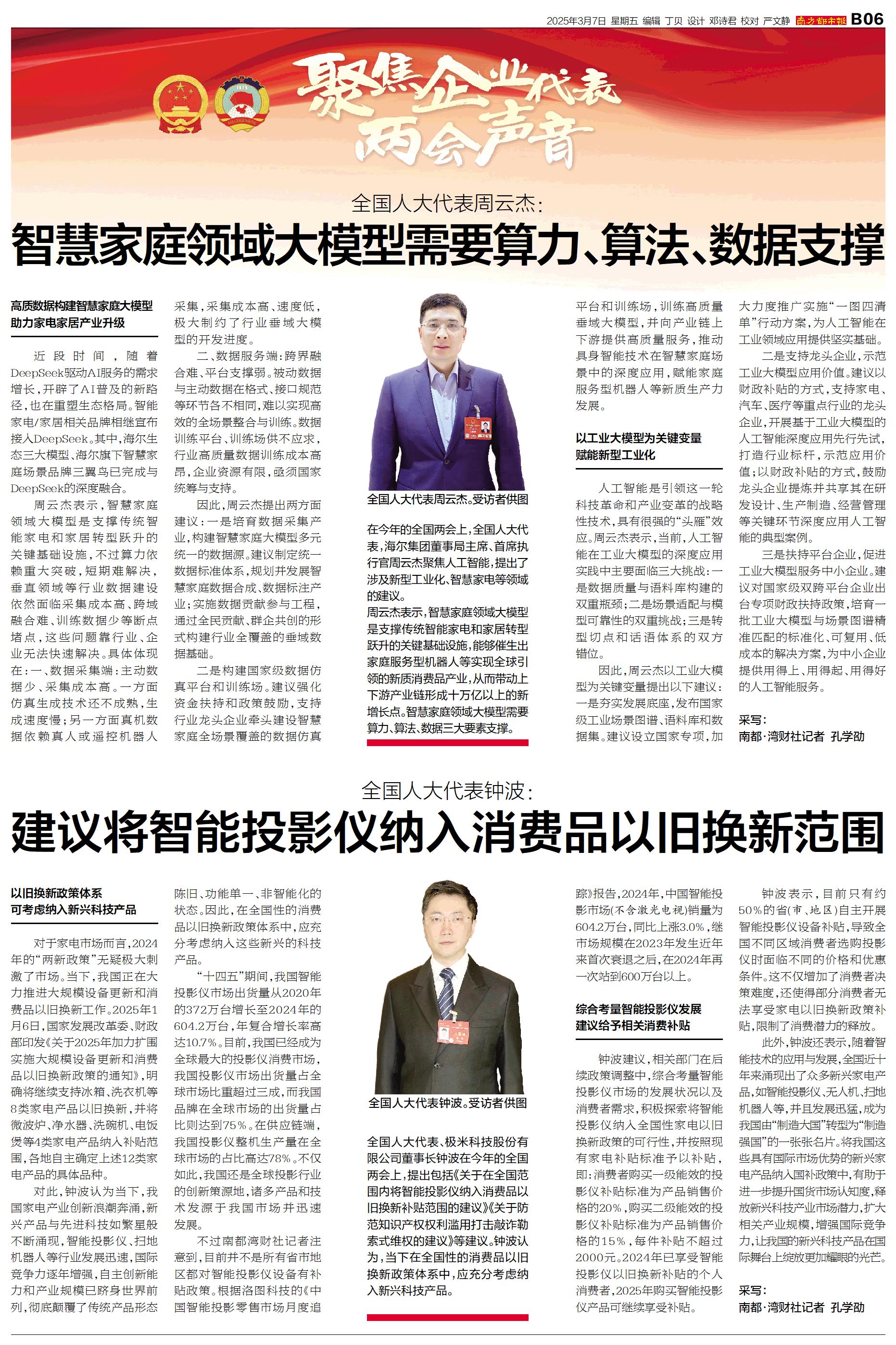全国人大代表、极米科技股份有限公司董事长钟波在今年的全国两会上,提出包括《关于在全国范围内将智能投影仪纳入消费品以旧换新补贴范围的建议》《关于防范知识产权权利滥用打击敲诈勒索式维权的建议》等建议。钟波认为,当下在全国性的消费品以旧换新政策体系中,应充分考虑纳入新兴科技产品。