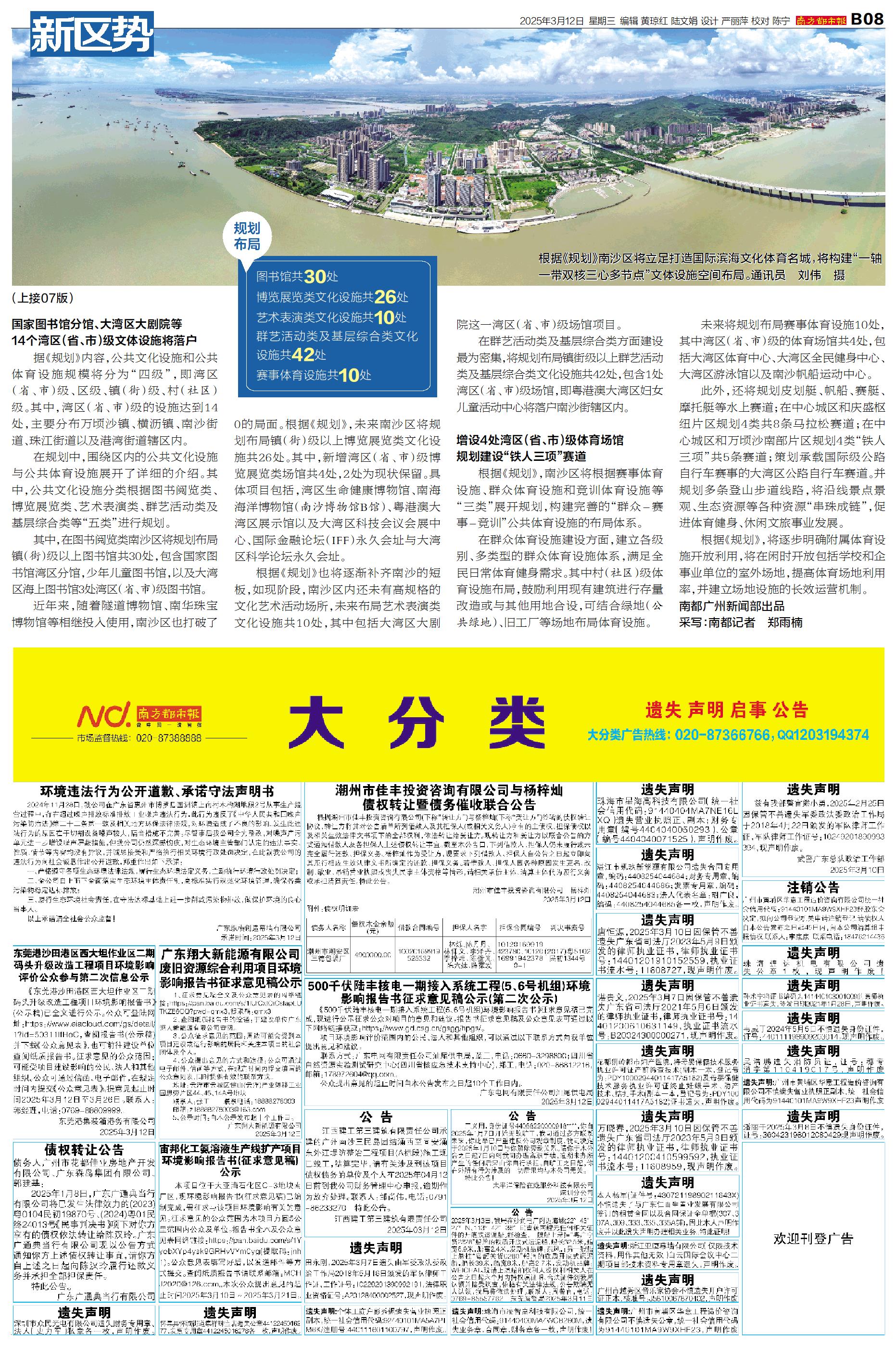 记者从广州市人民政府网站获悉,近日《广州市南沙区文化体育设施布点规划(2022—2035年)》(以下简称《规划》)正式印发。据《规划》内容,湾区(省、市)级的设施达到14处,国家图书馆湾区分馆、大