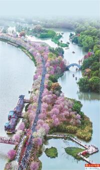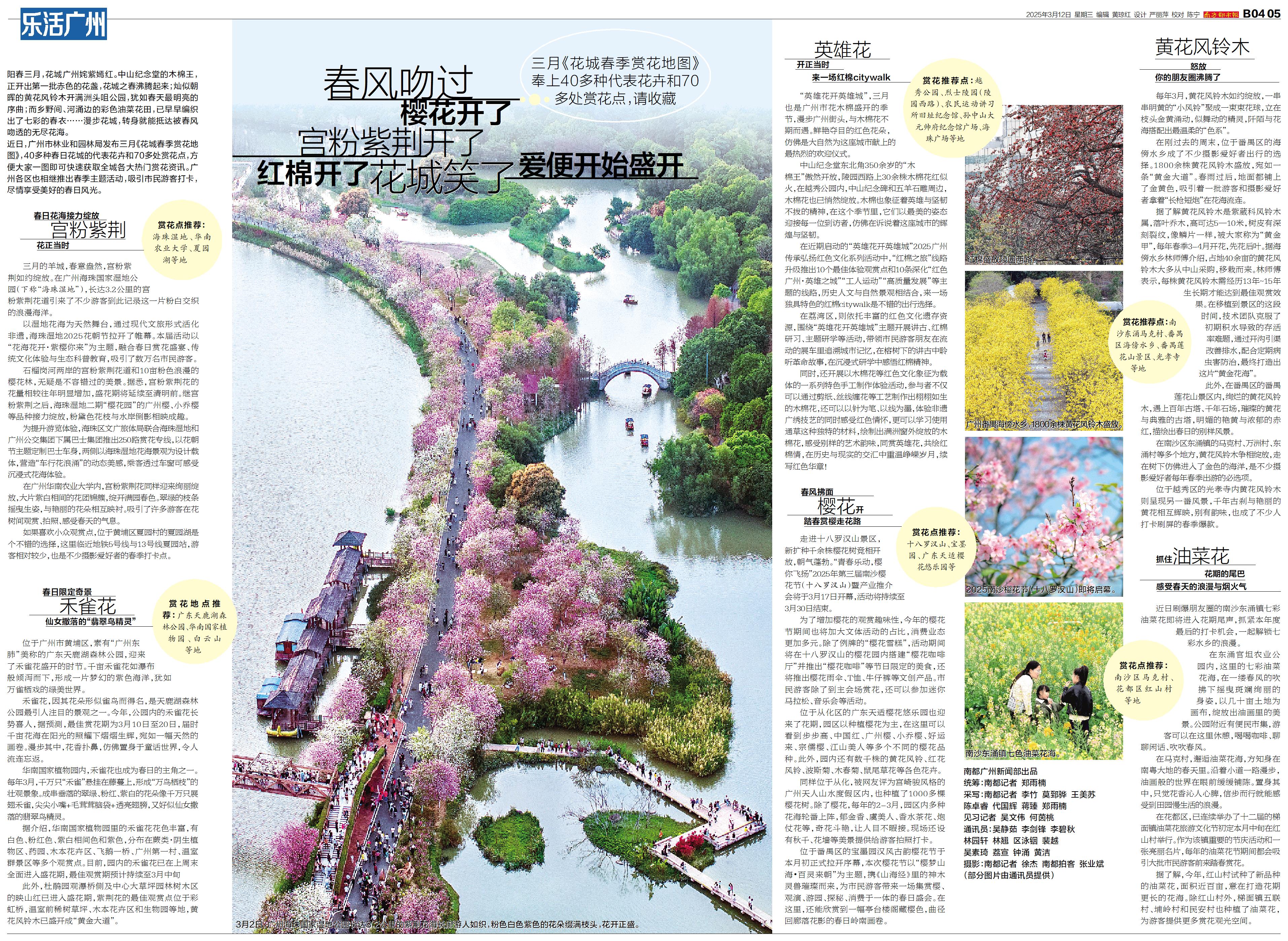 阳春三月,花城广州姹紫嫣红。中山纪念堂的木棉王,正开出第一批赤色的花盏,花城之春沸腾起来;灿似朝晖的黄花风铃木开满洲头咀公园,犹如春天最明亮的序曲;而乡野间、河涌边的彩色油菜花田,已早早编织出了七