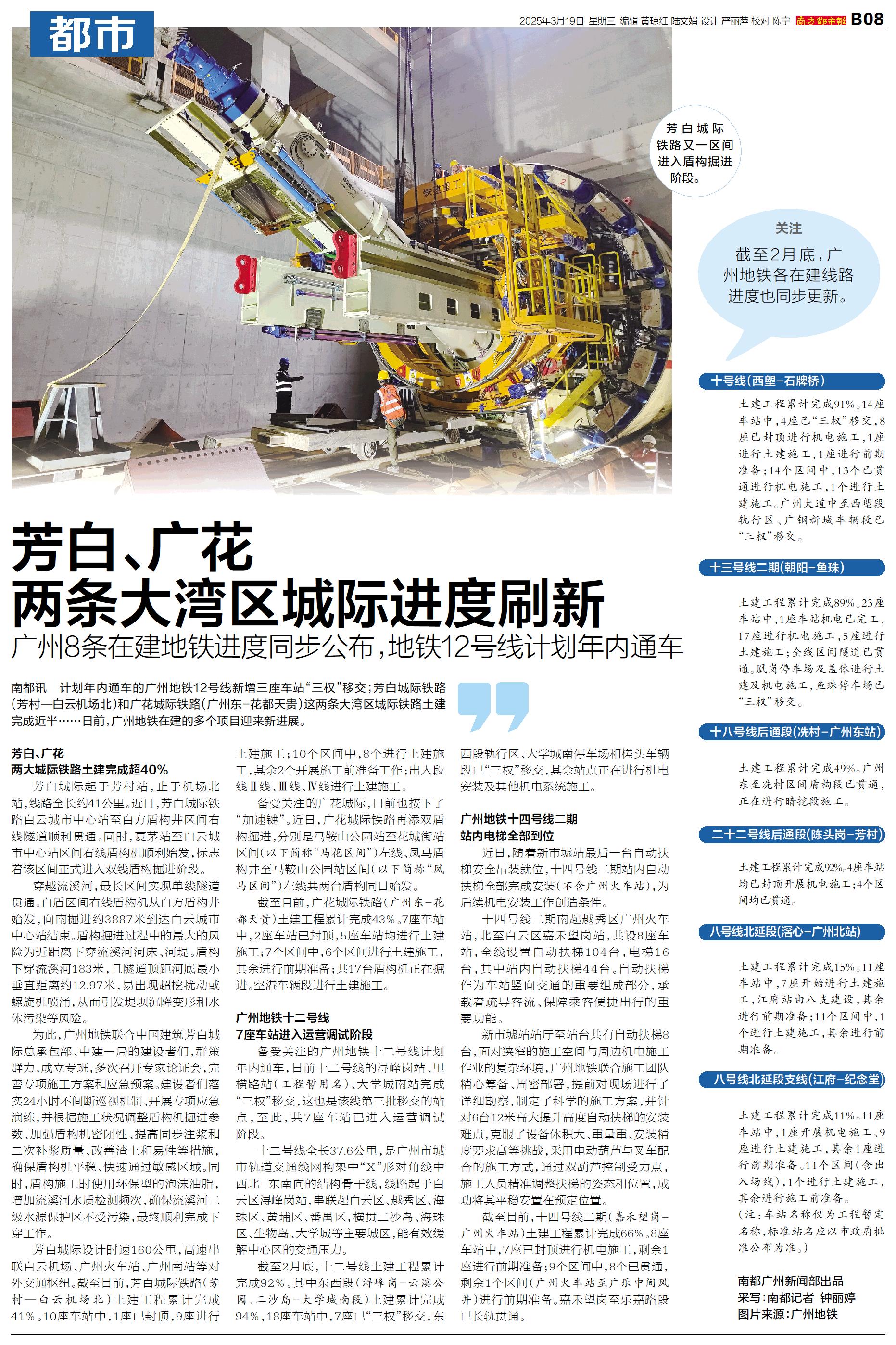 南都讯 计划年内通车的广州地铁12号线新增三座车站“三权”移交;芳白城际铁路(芳村—白云机场北)和广花城际铁路(广州东-花都天贵)这两条大湾区城际铁路土建完成近半……日前,广州地铁在建的多个项目迎来新进展。