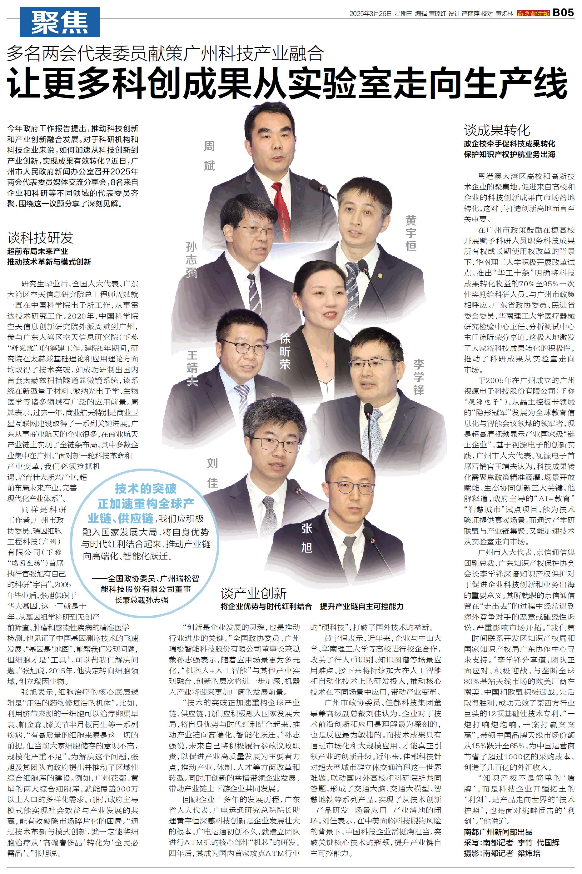 今年政府工作报告提出,推动科技创新和产业创新融合发展。对于科研机构和科技企业来说,如何加速从科技创新到产业创新,实现成果有效转化?近日,广州市人民政府新闻办公室召开2025年两会代表委员媒体交流分享会,8名来自企业和科研等不同领域的代表委员齐聚,围绕这一议题分享了深刻见解。