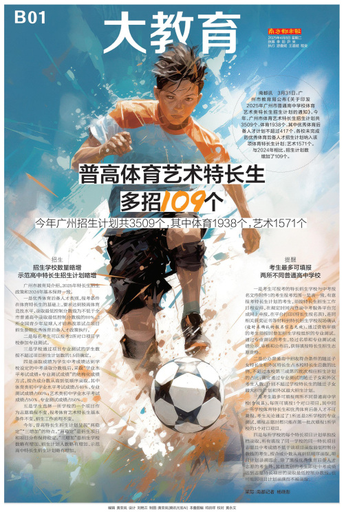 南都讯 3月31日,广州市教育局公布《关于印发2025年广州市普通高中学校体育艺术类特长生招生计划的通知》。今年,广州市体育艺术特长生招生计划共3509个,体育1938个,其中优秀体育后备人才计划