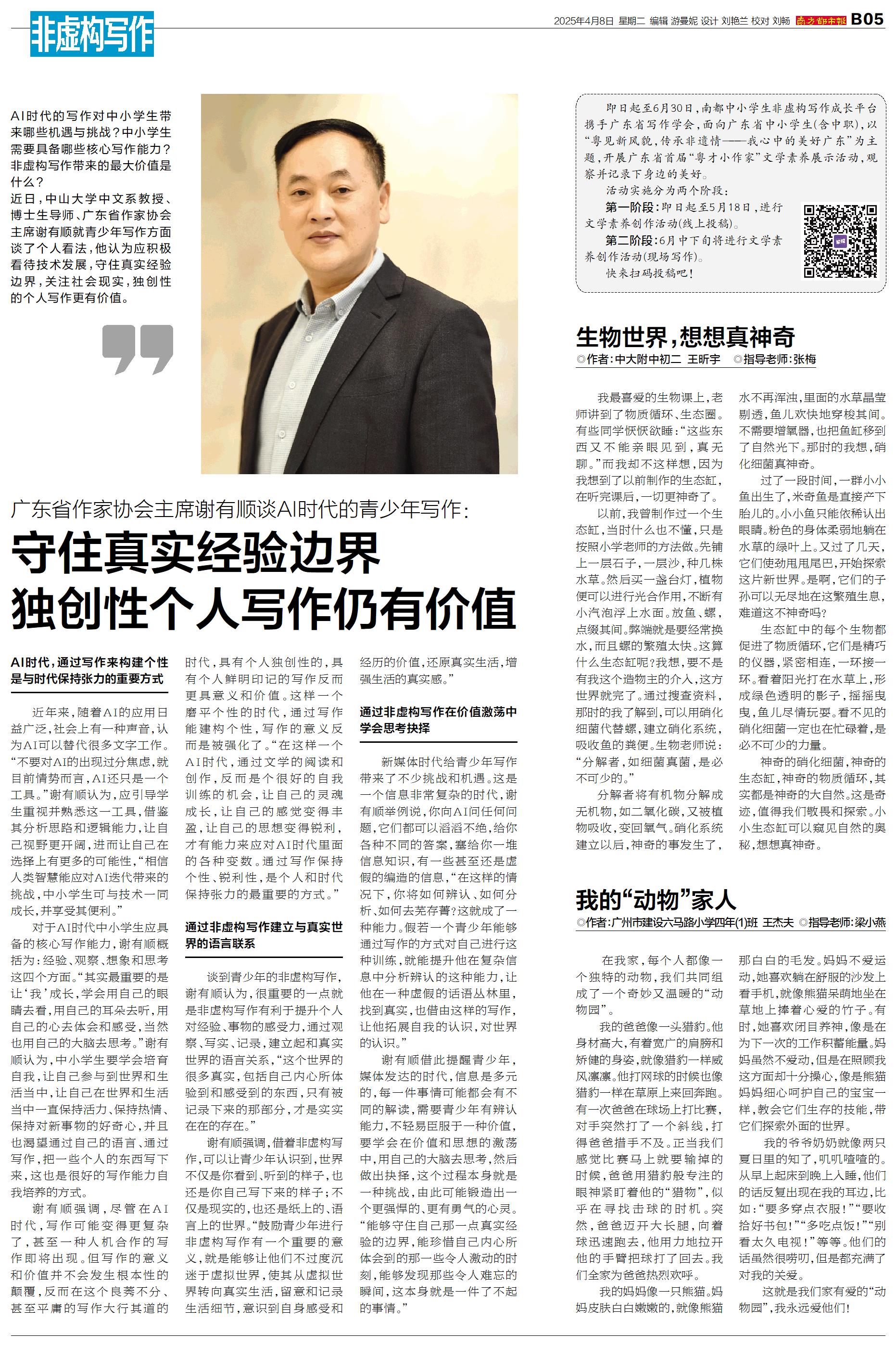 AI时代的写作对中小学生带来哪些机遇与挑战?中小学生需要具备哪些核心写作能力?非虚构写作带来的最大价值是什么? 近日,中山大学中文系教授、博士生导师、广东省作家协会主席谢有顺就青少年写作方面谈了