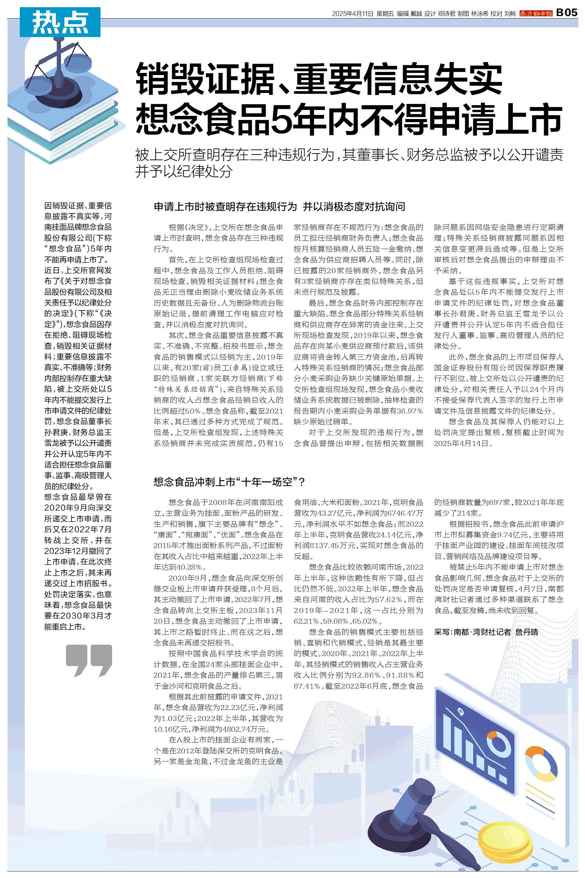 销毁证据、重要信息失实 想念食品5年内不得申请上市