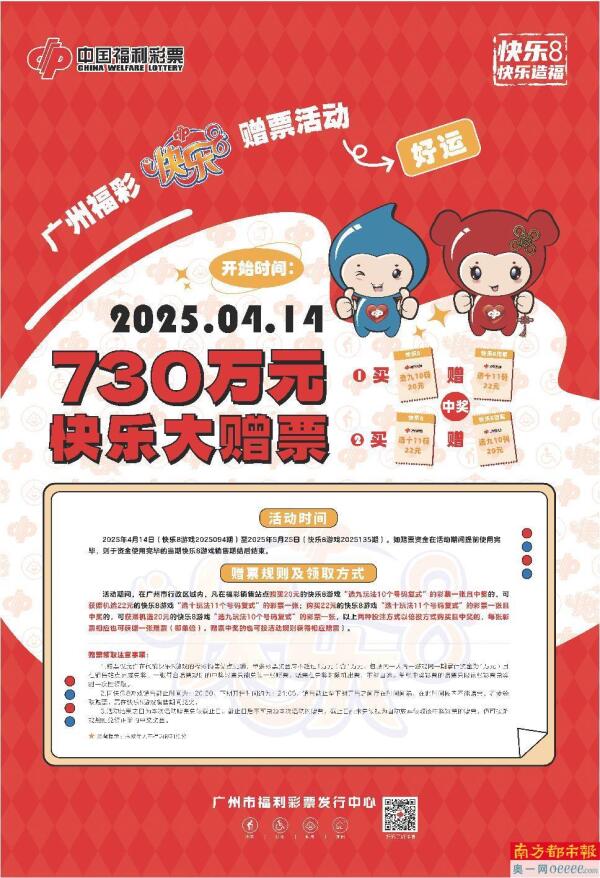 记者从广州市福利彩票发行中心获悉,为真情回馈长期以来关心和支持福利彩票事业的彩民朋友,该中心自2025年4月14日起,在全市范围内开展“快乐8快乐大赠票”促销活动,本次活动共安排赠票资金730万元,针对快乐8游戏两种玩法开展赠票。