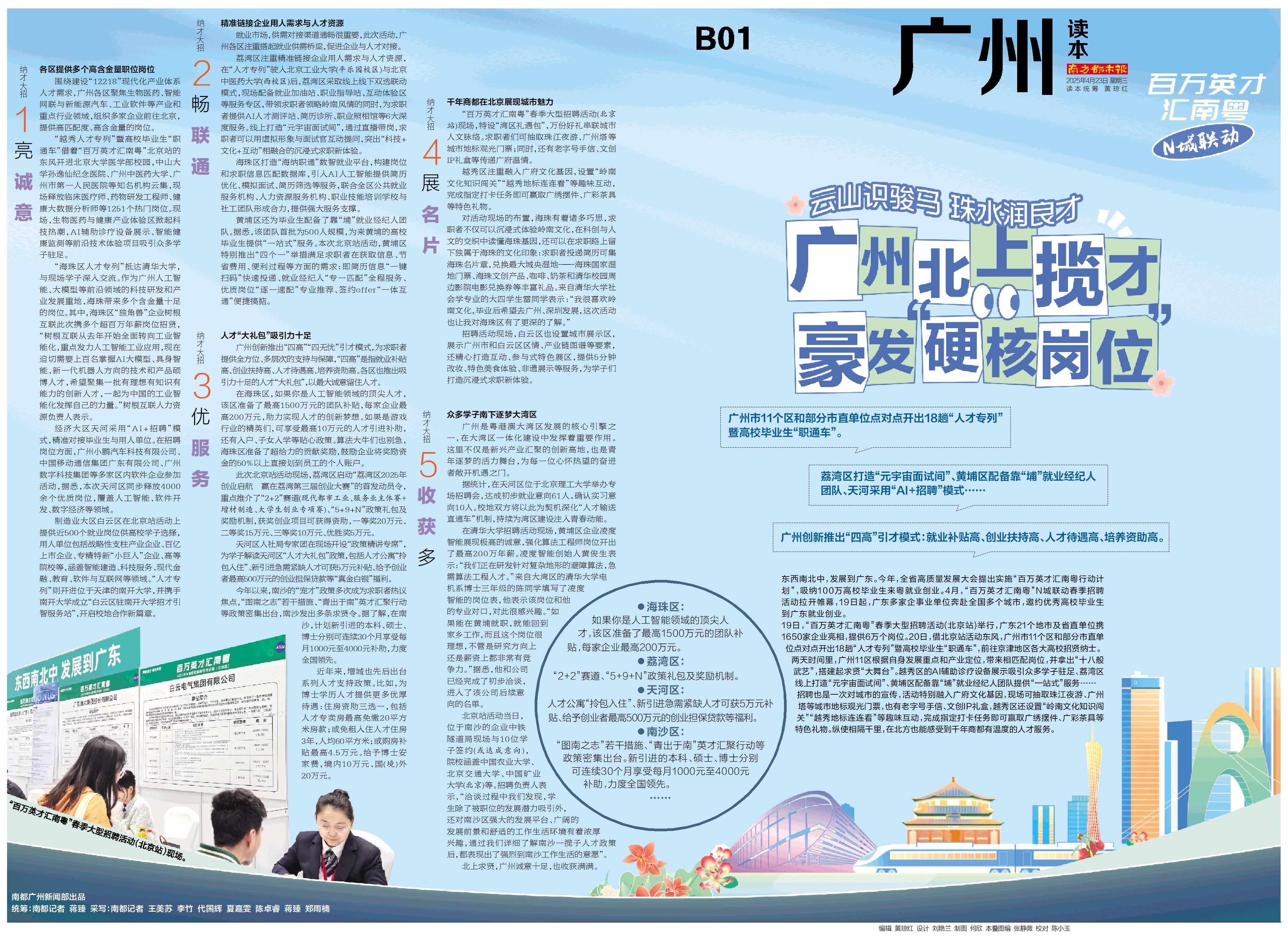 广州市11个区和部分市直单位点对点开出18趟“人才专列”暨高校毕业生“职通车”。 荔湾区打造“元宇宙面试间”、黄埔区配备靠“埔”就业经纪人团队、天河采用“AI+招聘”模式…… 广州创新推出“四