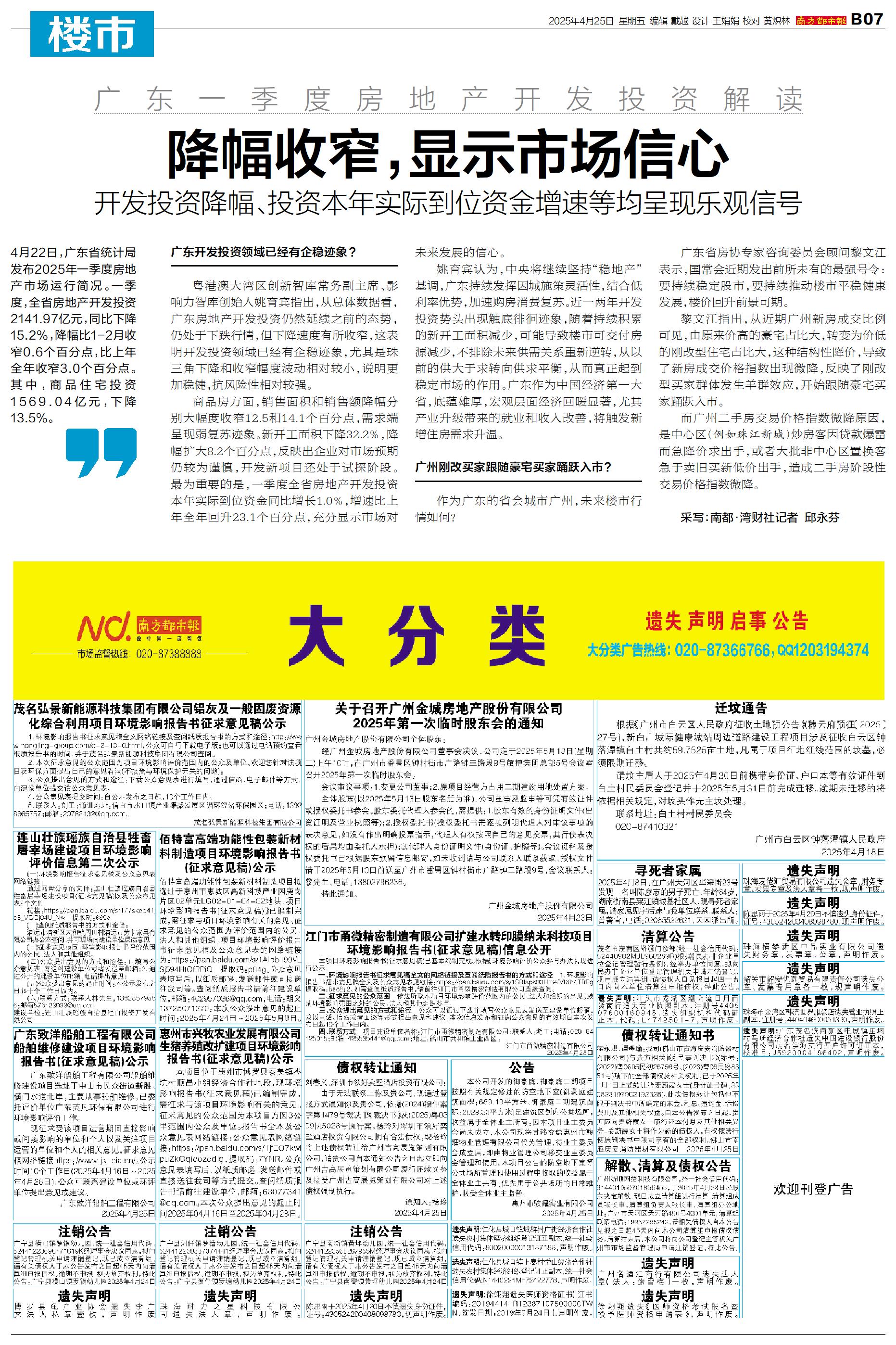 4月22日,广东省统计局发布2025年一季度房地产市场运行简况。一季度,全省房地产开发投资2141.97亿元,同比下降15.2%,降幅比1-2月收窄0.6个百分点,比上年全年收窄3.0个百分点。其