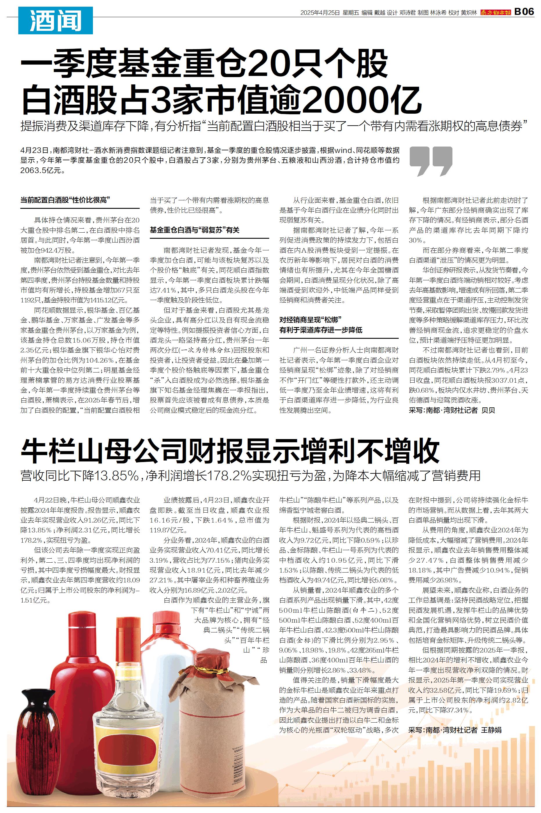 4月23日,南都湾财社-酒水新消费指数课题组记者注意到,基金一季度的重仓股情况逐步披露,根据wind、同花顺等数据显示,今年第一季度基金重仓的20只个股中,白酒股占了3家,分别为贵州茅台、五粮液和