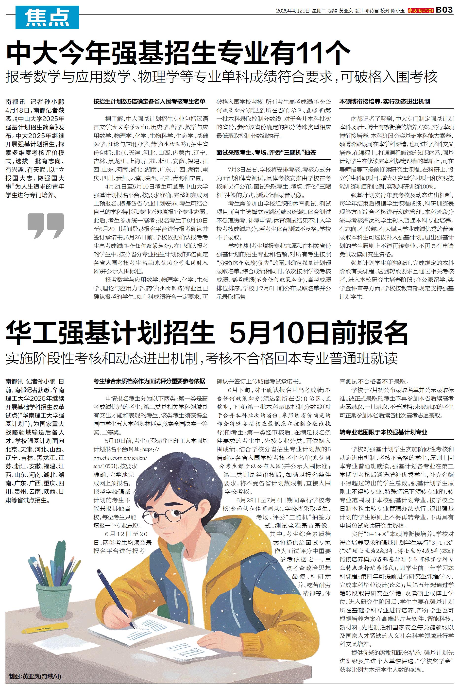 南都讯 记者孙小鹏 4月18日,南都记者获悉,《中山大学2025年强基计划招生简章》发布。中大2025年继续开展强基计划招生,探索多维度考核评价模式,选拔一批有志向、有兴趣、有天赋,以“立报国大志