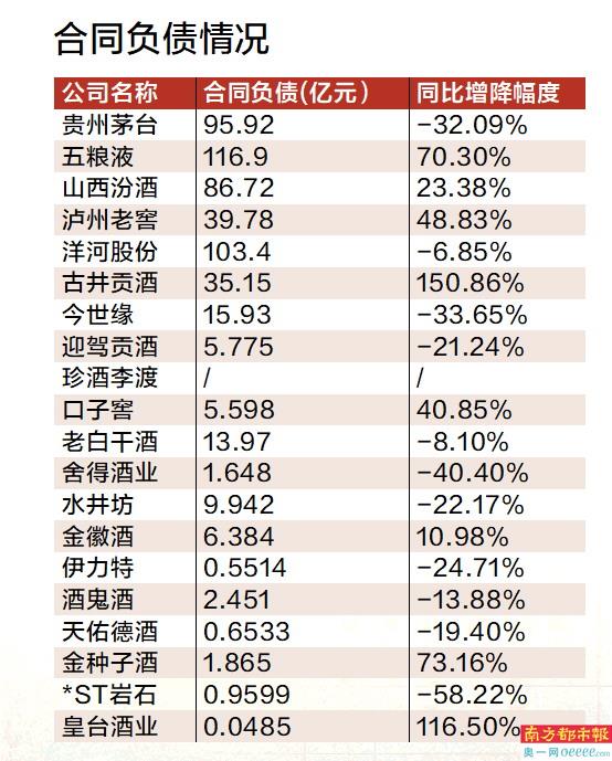 除了经销商数量的变化,白酒上市公司财报中“合同负债”一项也能说明问题。据了解,白酒行业普遍采用“先款后货”的销售模式,合同负债向来被视为企业业绩的“蓄水池”,它直观反映了经销商的打款积极性,也体现了厂商之间的合作紧密程度。合同负债高,通常意味着经销商或客户愿意提前付款来预订产品。
