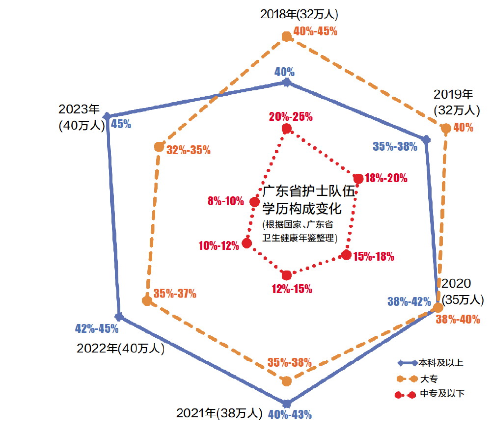 硕士课程深化了她对护理学的认知。学习护理理论时,她开始用护理哲学的视角去分析护患矛盾,尝试着用不同的护理模式去看待临床护理工作;学习护理学研究方法时,她发现护理学与人类学、社会学等不同学科碰撞出了璀璨的火花;学习循证护理学后,她尝试将循证思维融入专科敏感指标建设、临床质量改善项目中,收到了意想不到的效果。“现在我会追问护理工作的本质,这是科研思维的火种。”尽管尚未产出“高大上的成果”,但她相信,这种思维碰撞终将反哺临床。来自于广东和全国范围的卫生健康统计年鉴显示,2018年至2023年,全省注册护士中本科及以上学历占比从38%跃升至45%,硕士护士人数增长超200%。这一变化与政策支持密不可分:暨大附一院为在职硕士护士提供弹性排班,部分地市医院对取得学位者给予50%-100%学费报销。“学历是护士群体职业晋升的门票,但护理专业能力的提升才是关键。”林清然副院长表示道。