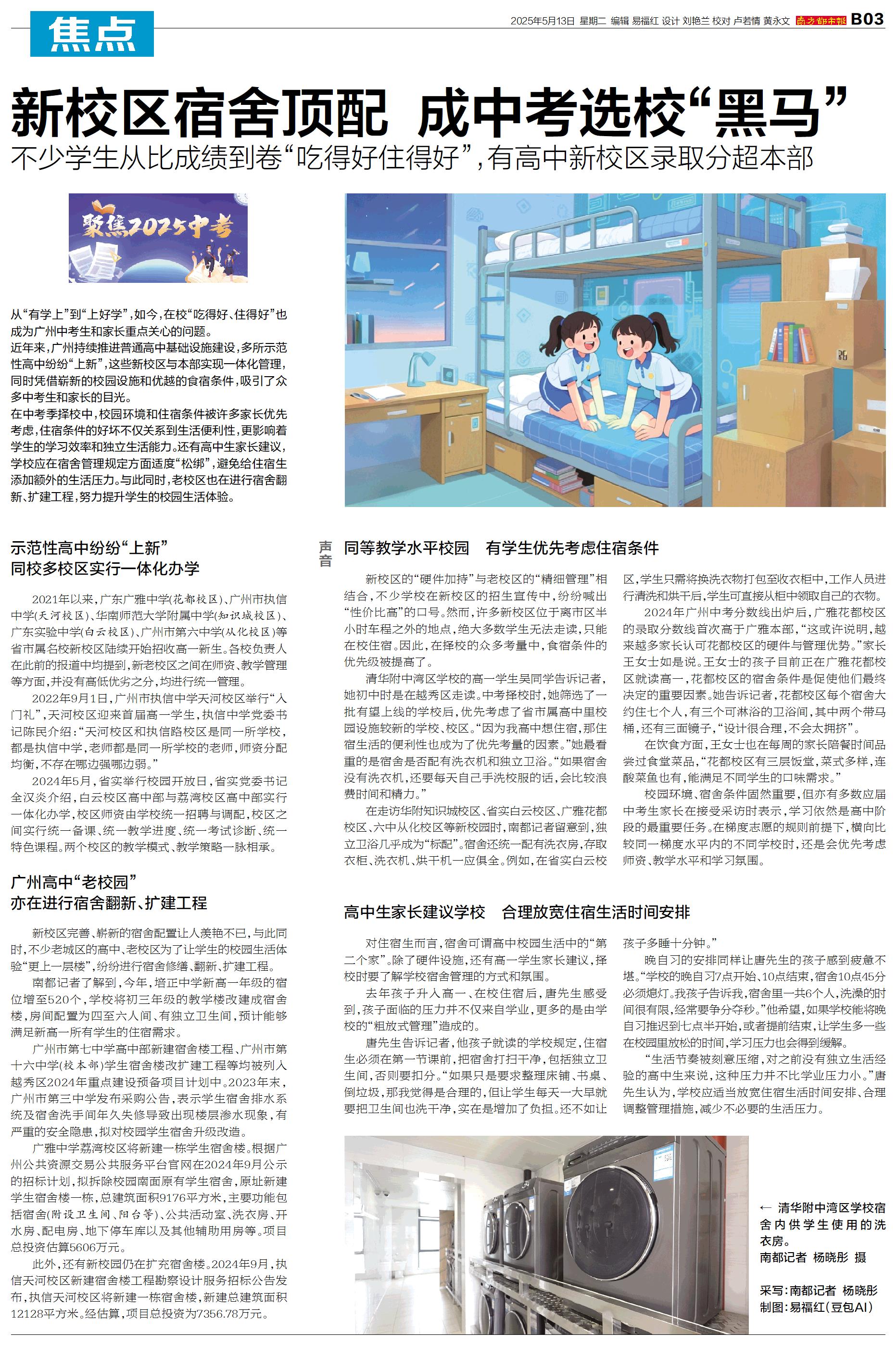 从“有学上”到“上好学”,如今,在校“吃得好、住得好”也成为广州中考生和家长重点关心的问题。 近年来,广州持续推进普通高中基础设施建设,多所示范性高中纷纷“上新”,这些新校区与本部实现一体化管理