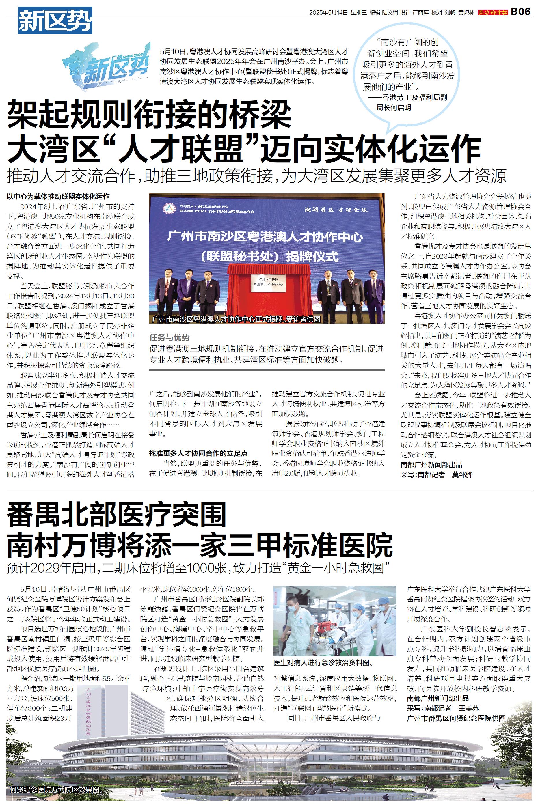 “南沙有广阔的创新创业空间,我们希望吸引更多的海外人才到香港落户之后,能够到南沙发展他们的产业”。 ——香港劳工及福利局副局长何启明 5月10日,粤港澳人才协同发展高峰研讨会暨粤港澳大湾区人才